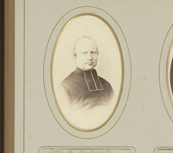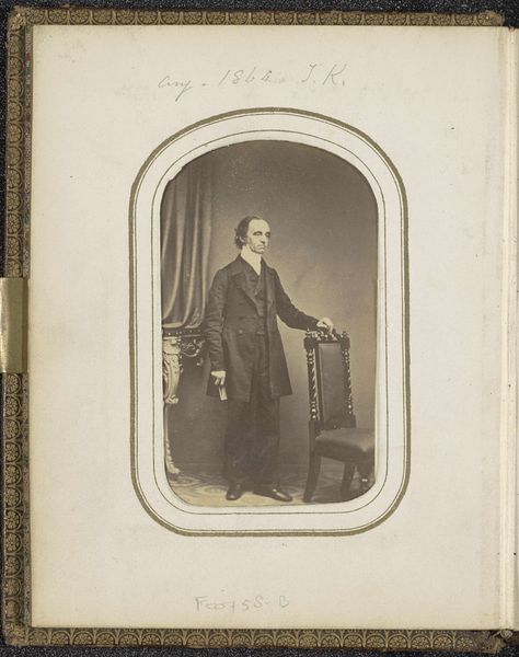 Curator: Here we have a gelatin-silver print from 1863 titled "Portrait of a Standing Man, referred to as Uncle Jim" by E. Andrews. It's quite striking, isn't it? Editor: It is. At first glance, I find a sense of reserved dignity. He has such a poised and somewhat melancholy demeanor, even though it's a formal, staged shot. I'm thinking about the social dynamics at play. Curator: Yes, exactly. I keep coming back to the surfaces depicted—the starched cloth, the polished wood, the glossy paper of the photograph itself—and I am intrigued how these elements come together through labor. A whole history of the social codes of dress and furniture manufacture contained in one little image. Editor: I agree. And the photographic process itself was, at the time, a fairly complex industrial undertaking. Do you get the impression of accessibility when viewing this image? Curator: Perhaps not in the immediate consumption of it, because having a portrait taken back then certainly reflected one’s social status. What's lovely, to me, is how it seems like the start of an intimacy, a fragile, suspended relationship. Almost like catching someone’s memory. The backdrop, that chair – does it belong to him, or is it a prop? Editor: The staged domesticity definitely leaves you pondering about the props, what kind of setting they represent and why he chose it to portray himself as an ideal family member. Did he have any saying over his likeness? Or the maker controlled most elements in this image. It certainly shows how portraiture operates under various industrial forces. Curator: Those are essential questions to think about in this portrait. Andrews gave us a glimpse into one person's universe in 1863. Editor: And now, hopefully, we’ve given our listeners some new lenses to reflect upon the artwork themselves.