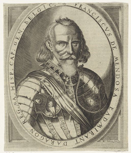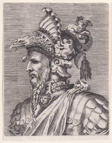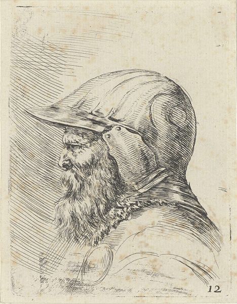 Eleonora Maddalena Gonzaga created this drawing, "Buste van een Romeinse soldaat," around 1660. It shows the head and shoulders of a Roman soldier. The somber tonal range immediately catches the eye, achieved through fine lines and cross-hatching. The soldier's helmet and armor establish the artwork's theme of military might. These elements work together to construct the image of a Roman soldier that references classical antiquity while subtly destabilizing the traditional representation of power. The soldier’s gaze is directed off to the side, creating a sense of anticipation. The handling of light and shadow adds depth, but also points to the artwork's engagement with ideas about visibility and obscurity. It encourages viewers to contemplate the complex interplay between artistic representation and historical narrative.