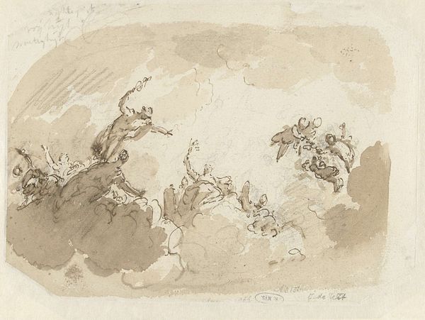 Editor: Here we have a drawing titled "Bacchus, Ceres und Flora mit Gefolge in Wolken schwebend." It's attributed to Jacob de Wit. From what I can tell, it's a pencil sketch, possibly a preliminary study for something larger. There’s a lightness to it, with figures floating on clouds. What do you see in this piece? Curator: The composition certainly emphasizes a sense of upward movement, doesn't it? Observe how the figures are arranged, primarily within the upper register of the pictorial space. This compositional strategy encourages the eye to travel upwards. Notice also the subtle gradations of light and shadow, achieved through the artist's skilled use of pencil. The chiaroscuro effect contributes to the overall sense of depth and volume. Editor: Yes, I can see that now, how the shading gives the clouds and figures volume. Is that the most important thing here, how the artist used pencil to create depth? Curator: Form, line, tone, and the ways in which the artist exploits them are indeed very important. I also see in this the artist's skillful articulation of form. Note, for example, how the drapery clings to and defines the contours of the figures, contributing to a sense of classical elegance. De Wit clearly manipulates the visual elements to construct a visually pleasing composition. What are your thoughts? Editor: I was so focused on the figures themselves; I almost missed how important the artist’s rendering of them really is. It’s a good reminder to look closely at those elements. Thanks. Curator: Indeed. By considering the formal elements and their orchestration, we unlock new layers of meaning within the artwork.