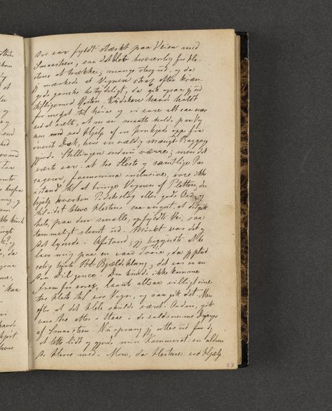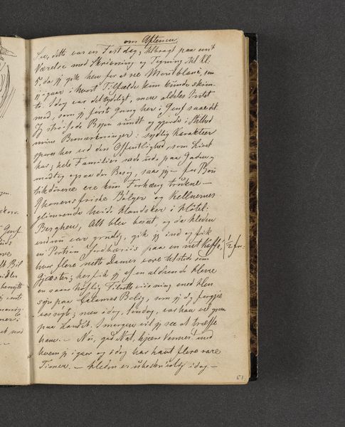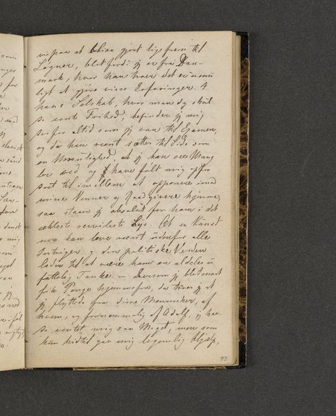 This is a page from Johan Thomas Lundbye's travel journal, undated, created with pen and ink. The most immediate visual element is the density of the text, a cascade of uniformly sized script covering almost every available space on the page. This creates a textured visual field, where the individual words and sentences merge into abstract patterns of light and dark. The tight, controlled lines of writing reveal an underlying order, but the content – likely personal reflections and observations – hints at a more complex interplay between structure and meaning. Lundbye’s journal operates as a semiotic field, where language functions as a system of signs, encoding cultural and personal experiences. The act of writing itself becomes a form of mapping, both of physical space and the interior landscape of the artist's mind. Note how the edges of the journal page show wear. This journal is not merely an aesthetic object but a site of lived experience, inviting ongoing interpretation.