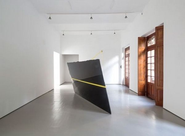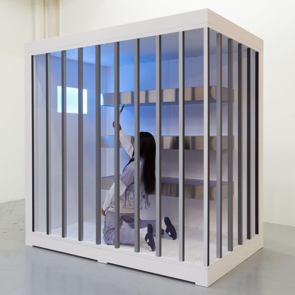Editor: Lindsay Seers' "Extramission 6 (Black Maria)" is an intriguing installation. The dark structure and hanging rope give it a somewhat ominous feel. What do you see in this piece? Curator: The 'Black Maria' alludes to Edison's early film studio, a site of visual experimentation. The rope, the color, the very structure echoes this, suggesting constraints but also possibilities of escape or revelation. Do you find any symbols particularly striking? Editor: The rope, definitely. It makes me think about control, or maybe even desperation. Curator: Precisely. It's a powerful, polysemous symbol. It holds layers of meaning, resonating with cultural memory. Seers utilizes this to explore how images shape our understanding of reality and history. Editor: That's fascinating. I hadn't considered the historical context of the "Black Maria" studio itself. Curator: Visual symbols carry emotional, cultural, and psychological weight over time. This piece is an exploration of this weight.