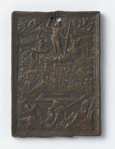 Curator: This relief sculpture, “The Crucifixion” made of bronze by Moderno, circa 1485 to 1499, presents such a vivid scene. The emotional density, achieved in such a shallow relief, is really quite striking. Editor: It certainly is. All of these figures rendered in bronze – you know, at first glance I just see chaos. What are we meant to make of this? Curator: I think focusing on the bronze itself gets us closer. Consider the labor: the mining, smelting, casting, and then the chasing and finishing to achieve this level of detail. Doesn’t the bronze itself, transformed through human effort, become a representation of the material conditions and societal forces that shaped this work? Editor: So you’re saying that understanding the labor involved is crucial to understanding the artwork? Curator: Precisely. The preciousness of bronze, how it signifies wealth and power...it elevates the scene, and also frames the labor inherent in creating the art. The intense effort in production contrasts sharply with the religious subject matter. It begs the question: How did religious narratives intertwine with economics? What was the interplay of faith and artistic patronage? Editor: It does re-frame the work. What about the mass production of such bronzes during the Renaissance? Did that impact its meaning or value? Curator: Absolutely. Bronze reliefs like this were luxury items, produced for an elite market. This challenges the narrative of the solitary genius artist; this work comes from workshop practices, a network of skilled artisans, and a specific economic structure. It highlights art as a form of production and consumption. Editor: That is quite a departure from how I initially approached the piece. Now, seeing it in terms of the labour and market forces makes me consider its societal value in a completely different light. Curator: Indeed. By acknowledging these aspects, we move away from solely admiring artistic skill to understanding how the means of production are equally relevant to the artwork's message and the socio-economic context of its making.