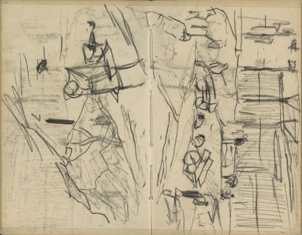 Curator: This is "Drie Mannen," or "Three Men," a drawing made around 1882 by George Hendrik Breitner, held here at the Rijksmuseum. What strikes you immediately about it? Editor: Its fragmented quality is compelling. The tilted orientation combined with the seemingly unfinished state evokes a sense of fleeting observation, a study in capturing a momentary glimpse. Curator: Indeed. It’s a page from one of Breitner's sketchbooks. Breitner was deeply engaged with capturing modern life, and these drawings were often preparatory studies for his larger works. Considering this was sketched around 1882, can you see any hints of industrial developments that influenced daily lives in Amsterdam, that may have shaped his process? Editor: Perhaps the clothing; the practical garments and caps suggest working-class individuals, their clothes indicating specific trades or roles within the expanding urban landscape. He is emphasizing new jobs through the sketches. Curator: Precisely! And think about the materials—pencil and paper, readily available, cheap, and transportable. These allowed Breitner to engage directly with the realities of the city. But, tell me, how do you perceive the balance and structure here? Editor: It's asymmetrical, dynamic even. The layering and varied line weights create a compelling visual rhythm, particularly how he's using the minimal resources to experiment with line and shade to achieve three-dimensionality. This directs our eyes towards the key figures. Curator: He used photography quite a bit in his process; those influences shaped the kind of realism and attention to capturing details that we see in all of his work. It reflects on art making at this time when the lines between mechanical reproduction and artwork begin to be interrogated and challenged. What does this all make you feel? Editor: I am touched by the immediacy, by its humble form. The unpretentious nature invites me to contemplate on everyday narratives of labor in the city at that time. Curator: The sketch is a fascinating record of those urban lives. Editor: Yes, it certainly provokes thoughts regarding the artistic practice behind capturing realism, too.