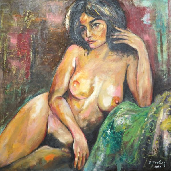 Rudolf Bér's painting 'Nude' is made using oil paints on canvas, a traditional pairing associated with fine art. The material has a profound impact on the work's aesthetic. See how Bér layers paint in expressive, visible strokes? Oil paint allows for blending, creating subtle gradations of tone and color, and the thickness of the paint gives the painting a tactile quality. Considered alongside Bér's artistic process, the material choices take on deeper meaning. Oil painting has a long and storied history, dating back centuries, yet here, it is not used to create a hyperrealistic effect. The emphasis is on a certain type of skilled labor, a painting completed by a trained hand in the studio. Paying attention to materials, making, and context encourages a deeper understanding of the artwork, and challenges the traditional boundaries of fine art.