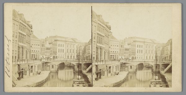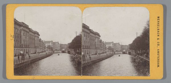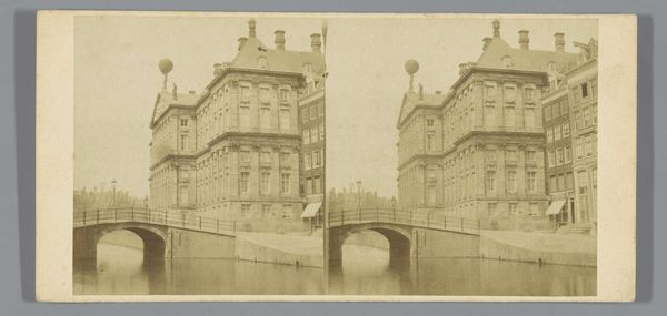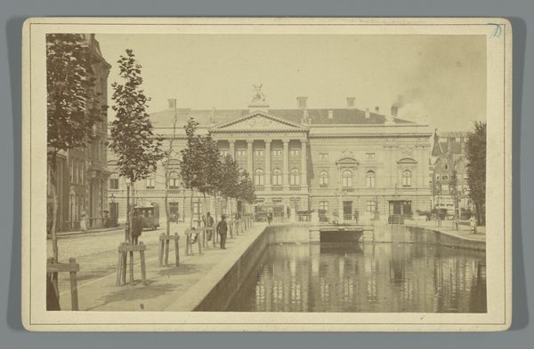 Curator: Here we have Pieter Oosterhuis’s photograph, "Koninklijk Postkantoor aan de Nieuwezijds Voorburgwal, Amsterdam," dating roughly from 1855 to 1865. Editor: It’s strangely calming, isn't it? Despite being a city scene, there's a stillness. The sepia tones contribute, softening the imposing architecture. I immediately notice the materiality—it’s a photographic print, right? I'm drawn to the contrast between the solid architecture and the reflected light on the water. Curator: Indeed. Oosterhuis captured this view of the Royal Post Office during a time of great change in Amsterdam. Photography itself was relatively new, and its ability to document urban spaces offered a fresh perspective on civic life. This area around the Nieuwezijds Voorburgwal was commercially important and in transition. Editor: That’s fascinating, knowing that this “new” medium documented changes already underway. I can’t help but consider the labor and technology involved. Each print represents not just an image, but skilled darkroom practices and the socio-economic dynamics of Amsterdam's emerging industry of image making and image consumption. Curator: Absolutely. And the choice to photograph a prominent building like the Post Office reflects its role in facilitating communication and commerce. It became an important component to Amsterdam’s, and the Netherlands’, larger infrastructure. It symbolized progress, something the middle class took immense pride in at that moment in history. Editor: Right. Thinking about that context enriches the visual experience. It goes beyond just appreciating the composition; we start to see how material production intersected with public service and shaped communal experiences. I am always captivated by images like this when one remembers that human hands shaped that photograph through every step, from emulsion to the finished product. Curator: And that history of human interaction with photographic materials provides important details of Amsterdam’s larger economic, political, and social history, illustrating a profound relationship between society, image, and ideology. This is a view that now resides in the Rijksmuseum. Editor: Indeed, its journey from a physical space within Amsterdam to a preserved artifact is its own kind of commentary. Examining images through labor and materiality creates access points that transform even traditional genres into new possibilities for critical observation.