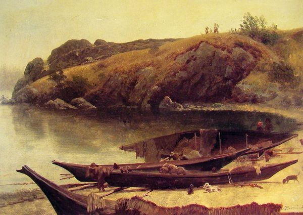 Editor: This oil painting is "St. Triphon's Brook in Pechenega," by Konstantin Korovin. It wasn't dated, but I see it's filed as impressionism. The overall mood feels very calm and serene. I’m really drawn to the boats pulled up on the shore and the way the light catches on the water. What stands out to you when you look at this piece? Curator: Immediately, I see how the artist uses light and shadow to imbue the scene with a quiet sense of longing, typical of seascapes of the time. Notice how the boats, although present, are empty. They serve almost as vessels of the soul, resting between journeys, reflecting a universal human experience of pause and introspection. Do you feel that the stillness amplifies the emotional resonance? Editor: Definitely. It makes me wonder where everyone is, and what their stories are. Are those boats commonly depicted in Russian art, do you know? Curator: Boats, yes, appear frequently, holding symbolic weight related to journeys, trade, and connection to the wider world, however, it's St. Triphon who offers a more telling link. He was a local Saint, and these waterways were vital. Consider how the very name of the brook invokes protection, blessings of safe passage, suggesting not merely a landscape but a sacred space for the community. Even now, a quiet place by water often calls on similar themes of faith, nature, and resilience. Editor: That's a great point about St. Triphon, it totally enriches the image, making me think about its cultural meaning, beyond just boats and water. Curator: Precisely! By layering realistic and symbolic elements, the artist creates a landscape imbued with deep cultural memory and continuous spiritual echoes. Editor: Thanks! I am going to think of the waterways in art quite differently now.