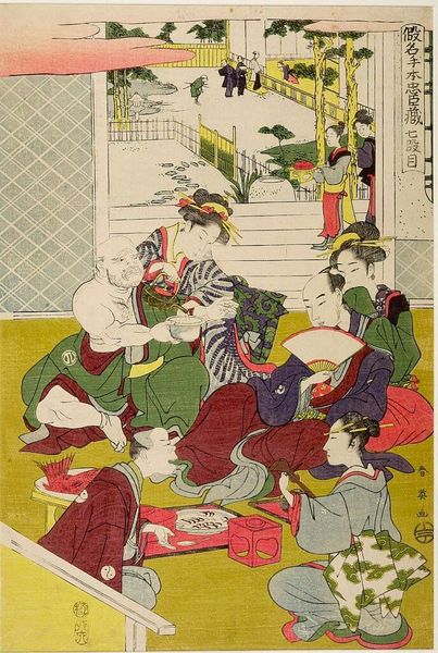 Curator: This print, attributed to Utagawa Kuniyoshi, is titled "Nambyō Ryōji" and is held at the Harvard Art Museums. The composition strikes me as chaotic, figures strewn about with little clear focal point. Editor: Indeed. The scene depicts what appears to be a healing ritual, perhaps a commentary on popular medicine or charlatanism. The way the figures are positioned creates a feeling of instability and unease. Curator: Note the deliberate use of line. The patterns on the robes create a complex interplay. The material reality of the print itself is critical to understanding Kuniyoshi's artistry. Editor: But let's also consider the social context. Who are these people? What are their class positions? How does this image reinforce or subvert social hierarchies? The red cartouche also feels significant. Curator: The layering of the colors, the textures created by the woodblock—it's all meticulously designed to create visual interest. Editor: It all speaks to the artist's engagement with his contemporary society. Curator: Ultimately, this print remains a fascinating and visually stimulating work. Editor: And a compelling historical artifact.
