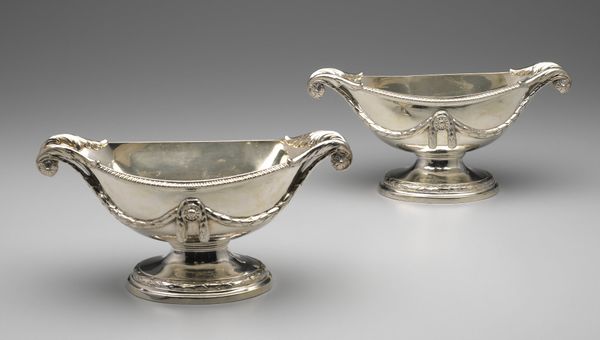 Editor: This is a pair of sugar baskets, crafted by Peter Bateman in England in 1794. They're made of silver and are just gleaming. I’m really struck by how simple, almost austere, they are. What can you tell me about them? Curator: Well, focusing on the materials themselves, silver was, and is, a luxury commodity. Who would have commissioned such objects and how would the acquisition of raw materials impact those in the colonies that provided the resources? Editor: So, you are talking about colonialism’s role in providing resources… Curator: Exactly. The late 18th century was a time of burgeoning consumerism, but that consumption relied on a very specific social structure with exploitative labor practices to support it. Someone likely mined that silver; someone smelted it, refined it, transported it... Consider the ceramic bowls these silver baskets might have contained—where was the sugar grown, harvested, processed, and shipped from? Editor: I hadn't thought about it that way, but it puts a whole different spin on these elegant little baskets. It shows a sharp contrast between refinement and heavy manual labor, and where these materials come from. Curator: And that's key to understanding the piece in its totality: that silver wasn’t just appearing, shaped from thin air, by someone. Editor: Definitely food for thought – literally! I appreciate seeing beyond the surface sheen to understand the complete network involved. Curator: Indeed, it’s crucial to examine the artwork as an object deeply embedded in social and economic relationships.