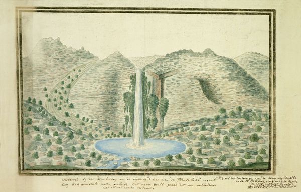 Editor: Here we have Robert Jacob Gordon's "View of the Augrabies Falls on the Orange River," dating roughly from 1778-1779. It’s rendered with watercolor, ink, and possibly colored pencil on paper. It gives such a serene, expansive feeling, though the landscape itself looks pretty unforgiving. What catches your eye when you look at it? Curator: Immediately, the rendering of space. Consider how Gordon structures our perception through layered forms. The composition employs a clear foreground, dominated by rocky outcrops and sparse vegetation, which recedes into a middle ground where the falls are only partially visible, before meeting the soft haze of distant mountains. Do you observe the systematic use of line and wash to define form? Editor: I see how the varying line weights give depth. The closer rocks are more defined, and then it gets fainter in the back. It almost feels like the artist is emphasizing the experience of seeing, more than strictly replicating the scene. Curator: Precisely. The texture is achieved with relatively simple means—short, hatched lines for the rocks, diluted washes to imply distance. Notice, the artist isn't necessarily trying to mirror reality but to create a sense of vastness and depth within a limited two-dimensional space. How do the cooler tones in the distance affect your reading? Editor: It pushes it back, and kind of emphasizes the browns and grays of the rocks. It also highlights the little pops of green. The way that it's structured, like a stage almost. It seems less about the specificity of place, and more about creating a feeling. Curator: I concur. It uses strategic arrangement of elements—almost a calculated emotional response from the viewer, prompting them to contemplate this immensity within the visual vocabulary he sets forth. What new aspects of the artwork do you recognize? Editor: Thinking about the formal qualities makes me realize it’s less documentary and more like a carefully orchestrated impression of nature's grandeur. Curator: Indeed. A calculated experience.