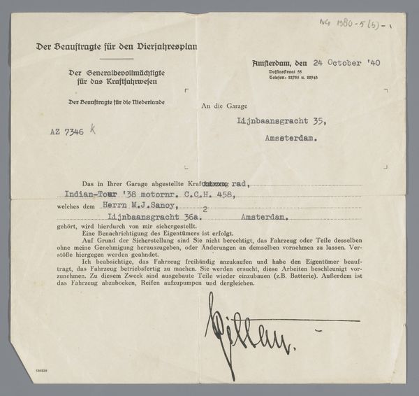 This document was created in Amsterdam on October 24, 1940, by the office of the Four Year Plan. It's a bureaucratic artifact, a tool of administration, yet it holds a strange kind of power. Look at the typewriter font. Each letter is uniformly impressed, a regimented grid across the page. Except for the signature at the bottom – a rebellious scrawl that breaks the rigid order. It’s the mark of a human hand, a moment of personal expression amidst the cold, impersonal text. The paper itself has aged, yellowed, and creased with time. It’s tactile and fragile, a relic of a specific moment in history. The ink is faded but still legible, each word a testament to the power of language, its capacity to control and define. This isn't just a document; it's a silent witness, a tangible fragment of a past that continues to resonate. Think of Hannah Arendt, or On Kawara, in the strange resonance of these traces of the past.