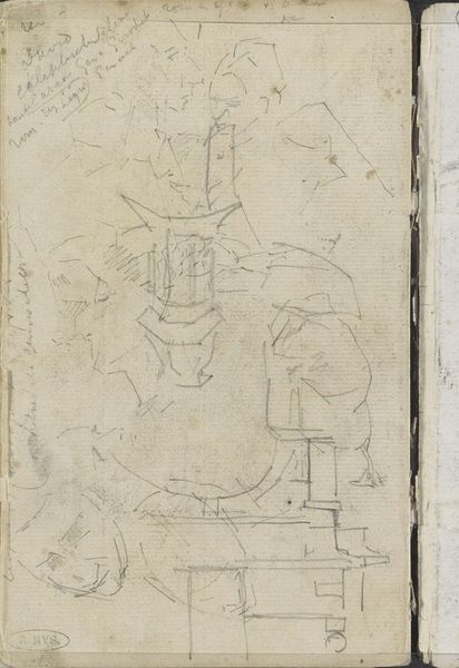 Curator: Alright, so, staring back at us is a quick sketch called "Man in wapenrusting en een helm"—that’s "Man in Armor and a Helmet" in Dutch. George Hendrik Breitner probably dashed this off sometime between 1883 and 1885. Editor: It looks more like he exploded this onto the page. It’s so raw and energetic, a real clash of metal and movement. Curator: Breitner was no stranger to capturing raw movement—horses were one of his obsessions. The dynamism in this sketch really comes through, doesn't it? Note how the light glances off the curves, hinting at the helmet’s depth and the metallic texture. Editor: I see how the composition is primarily driven by strong diagonal lines. The helmet and shoulders lean heavily, giving a real sense of instability, as if about to topple over or charge into action. The minimal shading almost abstracts the figure, forcing us to reconstruct the form ourselves. Curator: Exactly. It makes you wonder what the story behind it might be, doesn’t it? A prop from his studio perhaps? Breitner often explored modern life. Editor: Or perhaps an exercise in form? Breitner’s focus seems less about historical accuracy and more about how lines can define shape and volume. This isn't necessarily about the man, but rather about the armor as pure sculptural form. Curator: Hmm. But look at the detail in the joints and edges. Those clipped contours bring structure. And consider the quickness of the marks—you see it in his later photographs. Editor: Point taken! It is undeniably economical. Still, even in a brief study like this, Breitner is already laying bare the scaffolding, isn't he? Exposing the essential framework that lends visual impact. It’s almost Brutalist in its honesty! Curator: A Brutalist knight! I love it! I mean, the lack of sentiment is evident—there's no story, just lines on paper and the echo of a figure ready for something we will never know! Editor: Indeed. Well, in its rawness and its embrace of structure over sentiment, there's a lasting appeal. It transcends mere historical documentation, wouldn’t you agree?