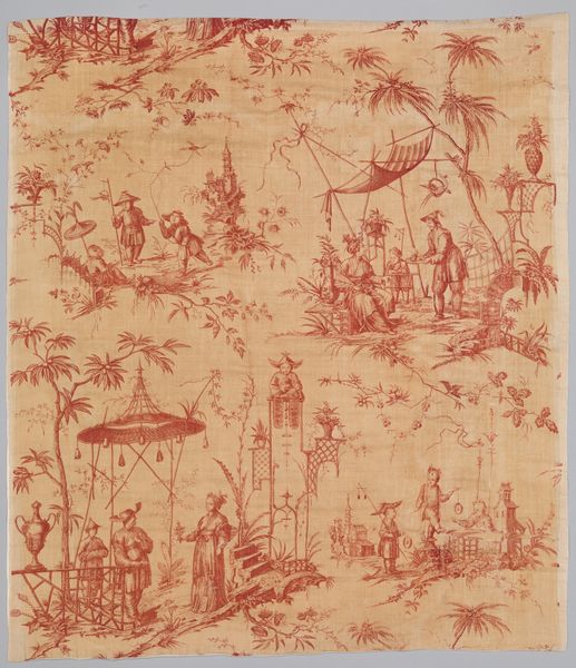 Curator: This delightful print, known as "Piece," dates from around 1765-1775. Crafted using etching and engraving, it is now housed at the Metropolitan Museum of Art. Editor: My first thought is “pastoral reverie.” It feels incredibly calming, almost hypnotic, in its repetition of motifs. Curator: Absolutely, its landscape style aligns perfectly with the Neoclassical yearning for a return to simpler, perhaps idealized, times. These decorative arts often subtly reflect the broader power dynamics of their era. The longing for an imagined past, especially by the elite, always begs the question of who gets to define and benefit from this selective nostalgia. Editor: The ruins, in particular, stand out. There's a melancholy in depicting them. Those fragmented columns, partly obscured by foliage—they carry so much historical weight. Classical ruins in art frequently serve as memento mori, a symbolic warning about the transience of life and empires. But these are gentler, almost romantic. Curator: You’ve touched upon a key tension here. On one hand, the classical motifs reference imperial power, but the delicate, almost ephemeral rendering in print softens that potential dominance. How might the symbolism of ruins shift when produced for domestic consumption, perhaps by the aspiring bourgeoisie, rather than for monumental public art? Editor: It makes one think about cycles of decay and renewal. Even the birds seem symbolic – messengers between different realms, observing history unfold from the treetops. What might they represent? Freedom? Divine presence? Curator: A poignant connection. Birds have always enjoyed polyvalent symbolism across cultures, and that ambiguity here enhances the print's layered meaning. They are both a decorative element and potentially a subversive one. Their song represents not only nature, but voices beyond the canvas. Editor: This journey into a scene draped with symbolism reveals how artworks, no matter how decorative, act as containers of cultural memory and unspoken social commentaries. Curator: It's a useful reminder that what we consider "decorative" often contains deep, if at times subtle, ideological content worthy of unpacking.