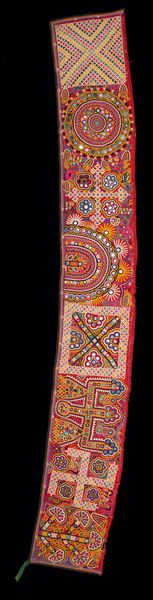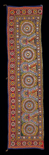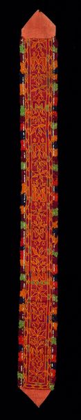 Curator: The colors are so vibrant. Immediately, I see festivals, rituals… a world far removed from the austerity I often associate with 19th-century textiles. Editor: Yes, there is such joy and vibrancy in this anonymous Textile fragment. Crafted between 1860 and 1880, now housed here at the Minneapolis Institute of Art, it offers a fascinating insight into the complex cultural and production contexts of silk textiles at this time. Curator: That date raises questions about trade routes, colonial influences, the roles of women... I can imagine it adorning a powerful figure. Or perhaps it played a part in spiritual ceremonies? The combination of abstract and geometric forms is suggestive, don't you think? Editor: Definitely, the interplay of these patterns makes the manufacturing process all the more intriguing. How were these complex designs realized? What technologies were used, and what skills were valued in the makers of these textiles? The patterns could very well carry cultural meaning, but understanding the labour behind these forms opens another dimension to appreciating the work. Curator: Indeed, the human labor is undeniably there—each weave, each choice of dye carries intent, purpose. But what's compelling is the symbolism. We're not merely looking at repetitive design. These abstracted patterns suggest stories and shared cultural knowledge. Editor: While agreeing there's storytelling inherent, I'm more focused on understanding its journey as a material object. I find myself thinking about the workers who extracted, spun, dyed the silk – the material's transformations along the chain of production. I believe the social conditions of its creation is integral to truly knowing the fragment. Curator: So true. I can't help but wonder about the narratives it holds within its fibres, the connections woven into its making. By situating this textile fragment within an intersectional framework, we can uncover silenced voices, explore issues of class, challenge Eurocentric biases in art history. Editor: Exactly! Recognizing that textiles have long been at the center of global exchange allows us to reconsider standard art historical narratives that so frequently overlook labor, class and processes of industrialisation. Curator: Thinking about both the socio-political framework as well as its manufacturing provides such a powerful perspective. Thank you for broadening my interpretation! Editor: And likewise! Considering your focus on social justice contextualizes the material realities, I’m thankful for a wider vision now.