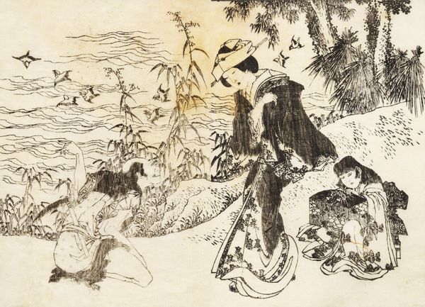 Curator: This is "Geese in Autumn Stream," a hanging scroll created around the mid-19th century by Tsubaki Chinzan. It's an ink painting on paper and part of the Asian art collection at the Minneapolis Institute of Art. Editor: My immediate feeling is one of stillness, broken by the sudden motion of the geese. The monochromatic palette gives it a very calming quality, despite the lively subject matter. Curator: Absolutely. Chinzan’s masterful use of ink wash creates depth and atmosphere. Note how the varying tones define form and texture—observe, for instance, the different values defining the rock textures and the geese feathers, despite the lack of colour variation. Editor: I’m drawn to the composition itself. The arrangement of the geese across the scroll leads the eye nicely. The blank space above, characteristic of Asian art, contributes to that feeling of tranquil vastness. Curator: What I find fascinating is how a piece like this connects to the broader art market of the time. These paintings were often made for a specific patron or as gifts, becoming commodities circulated within educated circles, showing the artist’s virtuosity with basic materials. Editor: Thinking of material, the artist's control of the brushstroke and the ink’s behaviour on the paper—it really communicates the artist's skill, and by extension, the value placed on that skill by their society. How this seemingly simple depiction of nature could be so admired. Curator: Indeed. Chinzan skillfully transforms simple, easily obtained materials – ink and paper – into a work that speaks to larger societal values around nature and artistic accomplishment. Editor: And formally, the delicate ink washes, the sparse but deliberate composition. It all harmonizes. It’s much more than just a literal representation of geese; it's about invoking a feeling, and a specific response related to nature. Curator: Precisely. It highlights how intertwined material accessibility and social context can affect artistic choices and valuation. Editor: It's clear to me how even an apparently straightforward landscape contains multitudes when one digs a bit deeper into its intrinsic elements. Curator: And for me, it's a potent reminder of how even the most accessible materials become valuable artifacts when filtered through skill, labor, and social currency.