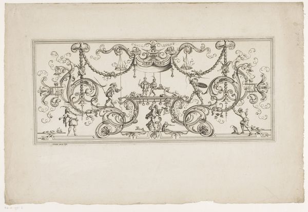 Stefano della Bella created this print, "Plate 14," a delicate dance of etched lines, capturing ornament during the 17th century. Here, cherubs frolic amidst swirling acanthus leaves, a motif stretching back to ancient Greece, symbolizing life, rebirth, and artistic inspiration. These cherubic figures remind us of the putti in Renaissance art, evoking a sense of innocence and divine love. Look at the scales, emblem of justice and balance, juxtaposed with the lively foliage. This combination speaks to the Renaissance ideal of harmonizing virtue with nature's abundance. Consider how similar foliage patterns also appear in Roman friezes, and even earlier, in the art of ancient Egypt. These motifs are not merely decorative, but vessels carrying centuries of cultural memory. They tap into a deep, almost subconscious level, reminding us of the cyclical nature of history and art.