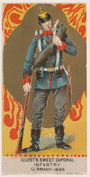 This small chromolithograph was produced by the Kinney Brothers Tobacco Company in 1886, as part of a series of military figures used to promote Sweet Caporal Cigarettes. But what does this image of a German infantryman tell us about the social and political landscape of the late 19th century? Germany, newly unified after the Franco-Prussian War, was flexing its military muscle. This card, with its detailed depiction of the soldier's uniform and weaponry, reflects a broader cultural fascination with military power and national identity. The inclusion of the smoking pipe is interesting: it reveals the normalisation of smoking in that period. Cigarettes and military service become intertwined with ideals of masculinity. To fully understand the image, we need to consider its original context. Advertising trade cards like these were designed to be collected and traded, circulating images of national pride and military strength to a wide audience. By researching Kinney Brother's business practices and marketing strategies, along with period sources, we can get a better idea of the complex relationship between commerce, culture, and the construction of national identity in this era.
