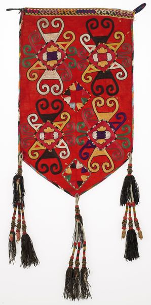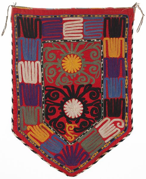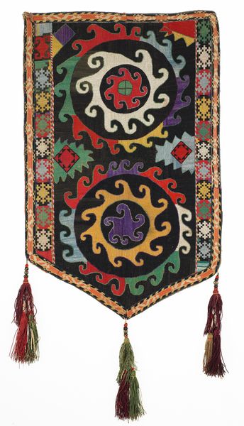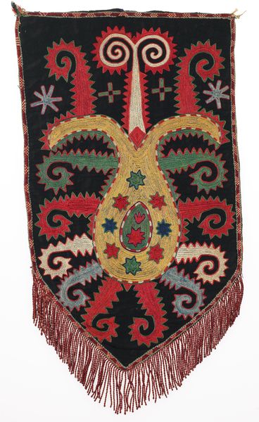 Curator: This captivating textile is titled "Uuk kap Ilgich" believed to be crafted around the late 19th century. Editor: Wow, my initial impression is this piece explodes with joy! The riot of colour combined with the almost playful asymmetry has something incredibly freeing. Curator: Indeed! Constructed with fibre-art techniques employing silk, wool, and cotton, the weaving embodies not just material artistry but an immersion into pattern. Consider how the geometric patterns create a captivating visual rhythm that feels both dynamic and balanced. Editor: And the sheer variety of patterns layered within patterns – it's a symphony of repetition. Tell me more about its origins, though. It clearly has some ethnic influences, and seems linked to Islamic art traditions. Curator: You've a keen eye! "Uuk kap Ilgich" hails from the Lakai people, weaving these textiles for both aesthetic pleasure and cultural documentation. You are right, its geometric complexities reflect a lineage rooted deeply in the world of Islamic art – a beautiful fusion where tradition sings! Editor: Looking at it this way, it definitely feels very symbolic and I’m curious if there's a narrative woven directly into it. Is the central shape symbolic or culturally representative of anything to the people who created it? Curator: I wonder if, perhaps, this “Uuk kap Ilgich” tells stories known only through touch—a family's history nestled within those fibres. Ultimately it becomes a symbol that transcends language and time, allowing anyone looking upon it to feel a connection. Editor: In its abstraction I suppose you find what you are looking for. Like seeing clouds in different shapes. And, it's those small subjective encounters with something like this piece that makes art sing to people. Curator: Agreed. Hopefully, the more one sees the work in its intricate construction, the deeper that emotional bond becomes. Thank you.