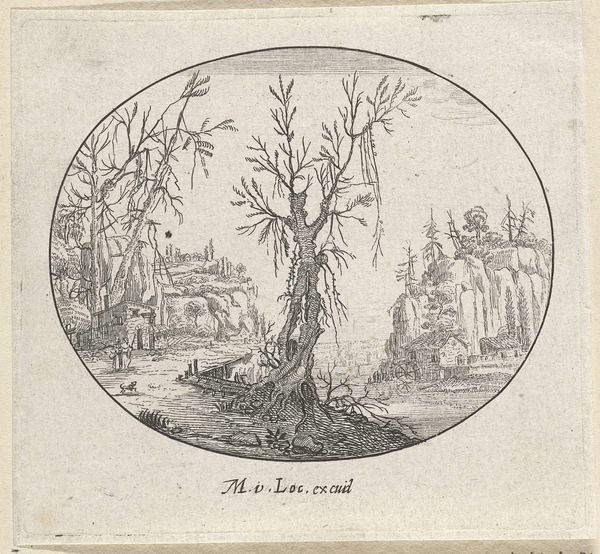 Editor: Here we have "Landscape with Figures at a Table," an etching and ink drawing by Charles de Hooch, dating from sometime between 1613 and 1638. The details are incredible, despite the small scale and monochromatic palette. What stands out to you in this piece? Curator: What immediately strikes me is the confident use of line to define form and space. Look at the density of the hatching in the foreground reeds, juxtaposed with the relatively open, airy rendering of the background architecture. This interplay creates a compelling sense of depth. Do you observe how the circular composition functions? Editor: I do. It feels like looking through a porthole, and contains the activity. Is that deliberate, do you think? Curator: Certainly. The tondo format is not merely decorative; it imposes a formal constraint, forcing the artist to reconcile the pictorial elements within a contained field. Note the strategic placement of the tree on the right; its curved form echoes the outer edge, further reinforcing the circularity and unifying the composition. Furthermore, examine the textural contrasts -- the rough, tactile quality of the thatched roof against the smoother, more polished surfaces of the table. What do these relationships suggest? Editor: So, by framing the subject matter, the lines, shapes, and tones guide us and influence the focus? The varying detail almost sculpts it. It is starting to make sense. Curator: Precisely! De Hooch employs these formal devices to orchestrate the viewing experience. It's not just a depiction of a scene but a meticulously constructed visual experience, drawing our attention to the essential pictorial components. A mastery of the print medium itself is shown in such detailing. Editor: Thank you, I see how closely observing lines and textures really shapes our experience with a piece of art. It’s about seeing, not just looking.