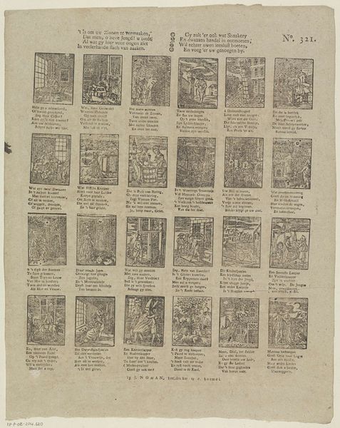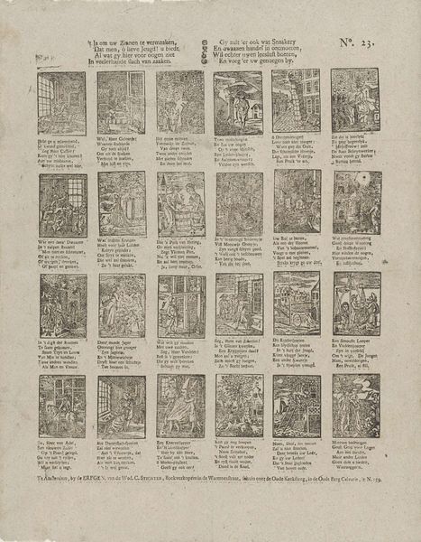 Curator: Here we have a fascinating print from between 1715 and 1813, titled "Zo ge aartigheden wilt beminnen...". It's an engraving on paper by Jan (Sr.) Oortman, currently held in the Rijksmuseum. It depicts a series of small scenes; it almost feels like a comic strip. How would you interpret the visual impact of this compilation of vignettes? Editor: It's definitely busy! The sheer number of images is a little overwhelming. The details within each scene are also a little hard to discern due to the engraving. I'm curious though, what would someone at the time, and maybe even Oortman, have thought of it? Curator: It's critical to think of the printing process and the accessibility this afforded. This isn’t some unique oil painting destined for a wealthy patron’s private collection. It’s a print! This implies a different kind of consumption, perhaps more democratic and intended for broader circulation. Editor: That's a great point. The availability of printed images likely impacted its meaning. So what stories would these pictures be depicting, what meaning would the consumer be trying to access, and how does their context add significance? Curator: It may seem didactic. Look closer, are they moral tales being visually reproduced on paper, or is something else at play here? Who could read this and why? Who would consume these works, and for what purpose? Editor: So rather than individual artistic genius, the emphasis is on production, consumption, and the social impact of these prints. They become less about aesthetics and more about the material conditions of their creation and distribution. It's interesting to view the artist as one part of a larger system! Curator: Exactly! We move beyond simple aesthetic appreciation and engage with the economic and social forces that shaped the art itself and continue to imbue them with significance to this day.