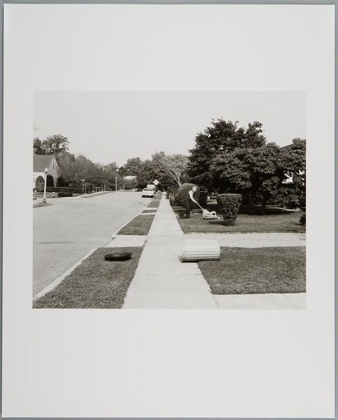 Curator: John Gossage’s gelatin silver print, "Untitled (lawn with car in driveway)" offers a slice of American suburbia. The image itself measures about 27 by 34 centimeters. Editor: It feels...stark. That black and white drains any sense of cozy nostalgia right out. The car looks almost sinister lurking there. Curator: Gossage often focused on the overlooked, the banal landscapes shaped by human activity. He lets the photographic process speak. The paper stock, the development, the scale of the print itself, all these material decisions contribute to meaning. Editor: It’s like a stage set, and the car is waiting for its cue. I wonder what sort of lives are being lived behind those pruned bushes. Curator: The absence of people is key. We are left to consider the systems at play, the economics of lawn care, car ownership, the very construction of the suburban dream. Editor: There’s a quiet melancholy to it that I wasn’t expecting. Curator: Indeed, and it's through his mastery of photographic materials and deliberate focus that Gossage evokes such complex feelings from such ordinary subject matter. Editor: Well, it certainly makes you think, doesn't it? It's more than just a picture of a car and a lawn, that's for sure.
