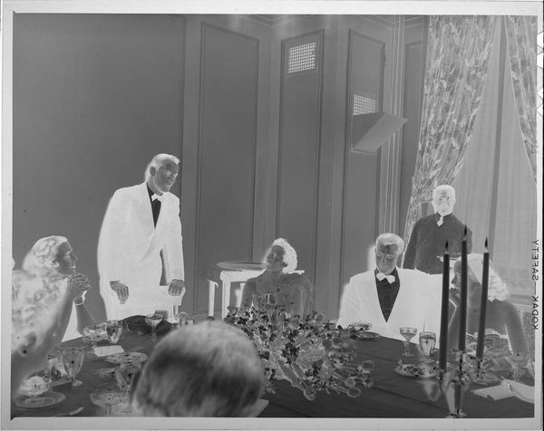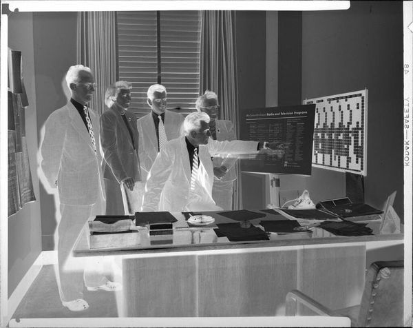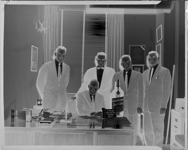 Editor: Lester Cole's small, untitled photograph captures five businessmen seemingly in deep discussion around a table. It feels like a pivotal moment frozen in time. What details stand out to you? Curator: The severe formality, like a dance of power and ambition, strikes me. The suits are like armor, aren't they? And yet, something about the slightly awkward poses suggests a vulnerability, or perhaps a lack of ease beneath the surface. Have you noticed the framed painting? It hints at a world beyond the boardroom. Editor: That's a great point. It's easy to get lost in the foreground and forget about the background. Thank you! Curator: My pleasure! It's a reminder that even in the most controlled environments, there's always a larger story unfolding, wouldn't you say?