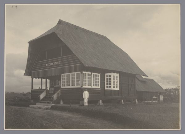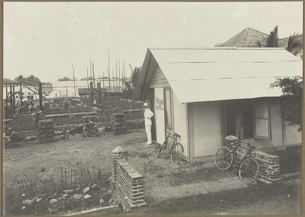 This photograph titled "Woonhuis" by K.J. John captures a residence in an undefined location. It appears to be constructed primarily from timber and possibly brick, judging by the stacks of materials surrounding the house. What strikes me is the amount of labor that went into sourcing, preparing, and assembling these materials. The framing, cladding, roofing, and detailing would have required a significant amount of manual work. Even the bricks that we see scattered around suggest a laborious process of manufacturing and transport. This resonates with broader issues of class and labor within the history of art and design. Often, the immense effort embedded within the production of architectural forms is overlooked. We should remember that the visual qualities of this building, and others, are directly related to the many hands involved in bringing it into being. It underscores the importance of considering materials, making, and context when trying to understand the full meaning of an artwork.