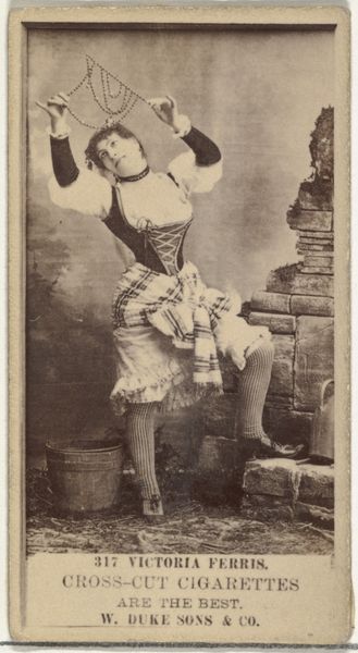 This card from the Actors and Actresses series, issued by Duke Sons & Co., presents us with May Johnston in a costume, likely for a theatrical role. Her garb, particularly the bonnet and tunic-like dress, recalls the attire of innocence and pastoral simplicity. But let us not be too quick to accept this at face value. The figure, with her hand raised in a gesture of what could be either defense or playful defiance, echoes poses seen in classical depictions of nymphs or even allegorical figures caught in moments of transformation or revelation. Consider the way similar gestures appear in Renaissance paintings, where a raised hand might signify knowledge, power, or a divine touch. Here, in the context of a cigarette card, the gesture is repurposed, transformed from sacred to secular. It hints at the actress's power to captivate, to transform herself, and perhaps, to tempt us, the viewers, much like the advertised cigarettes. The resonance of older symbols is used to create a captivating, if fleeting, moment of allure.