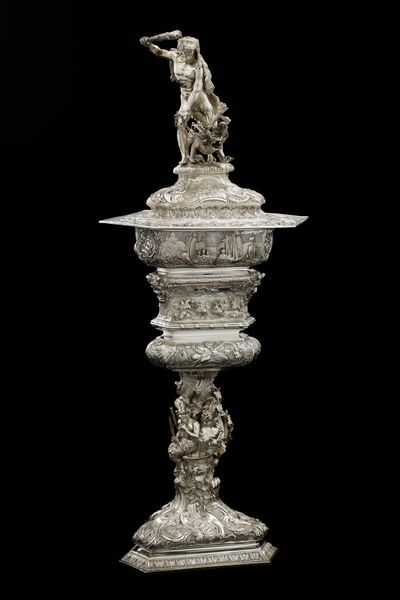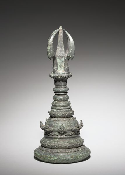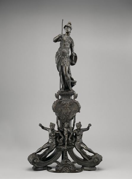 Curator: What a striking object! It's the "Perfume Burner Surmounted by a Satyr," a bronze piece created by Desiderio da Firenze between 1527 and 1543. Editor: Immediately, I’m struck by the visual hierarchy. The satyr perched atop focuses my gaze, almost like a musical note held high above a complex score. The contrasting textures—the smoothness of the satyr against the detailed base—are incredibly engaging. Curator: It really showcases the virtuosity of bronze casting during the Italian Renaissance. Think about the workshops where this piece was conceived—the collaborative effort involved in modeling, casting, and finishing such an intricate object. Editor: Indeed, the workmanship is undeniable. However, my focus is on the semiotics at play: The satyr, traditionally a symbol of hedonism, crowns what is essentially a functional object, a perfume burner. The contrast seems purposeful, a tension between pleasure and utility. Curator: Absolutely. And consider the social context: perfume burners were luxury items, signifying wealth and status. Owning such an elaborately decorated piece underscored a patron’s taste and resources. It was both a functional object and a potent symbol of power and luxury, intended for elite consumption. Editor: The interplay of textures, from the rough hair of the satyr to the smooth finish of its instrument, guide the eye and lend tactile value to the smooth coolness of bronze. But why this form? Curator: The imagery aligns with the Renaissance fascination with classical antiquity, so, it reflects how patrons wanted to see themselves: sophisticated, worldly, connected to the past, as that period embraced new modes of production. Editor: I agree. By understanding the structure and symbolism inherent in this piece, we see how its construction gives form to an ethos, the Renaissance worldview that blends sensual indulgence and cultivated refinement. Curator: Examining the materiality allows us to consider artistic patronage and the circulation of such pieces during the early modern period and offers insights into Renaissance social structures. Editor: True. Looking closely lets us decode those Renaissance sensibilities encoded in line and form. Curator: Exactly, now both elements connect, providing a comprehensive interpretation of its artistry.