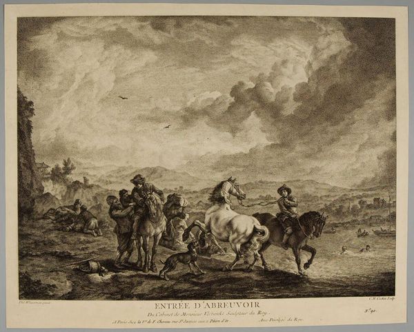 Editor: We're looking at "Landscape with Five Cows by a River," an etching by Henricus Josephus Antonissen from 1767. The etching is quite detailed and creates a sense of peaceful rural life, despite what appear to be storm clouds gathering overhead. What do you see in this piece? Curator: I see more than just a pastoral scene; I see a reflection of power dynamics embedded in the 18th-century Dutch landscape. Antonissen’s idealized view masks the socio-economic realities of the time. Consider, who benefits from this idealized representation of agricultural life? And whose labor makes it possible? Editor: That's an interesting perspective. I hadn't thought about it beyond face value. What clues within the etching suggest those hidden power structures? Curator: Look at the positioning of the cows, their apparent health, and their centrality to the composition. These cows are symbols of wealth and agricultural productivity, yet the labor of the people connected to them are completely missing. This absence reveals a societal tendency to valorize property while rendering invisible those who toil. And note the looming storm; it could represent the impending social upheavals threatening the existing order. Do you agree? Editor: Yes, I do see your point about the labor being hidden. So you’re suggesting that idyllic landscape art like this functioned, in part, to legitimize the existing social hierarchy? Curator: Precisely! The visual representation of a harmonious agrarian existence reinforces dominant ideologies by suppressing alternative narratives. Further, art was available mostly to upper classes perpetuating a positive image of ownership. It served as a powerful tool in maintaining social control, and therefore it demands questioning from a contemporary point of view. Editor: Wow, I'll never look at a pastoral landscape the same way again! Thanks for sharing your insight and widening my understanding. Curator: And thank you for being open to these connections. The past speaks to the present when we ask the right questions.