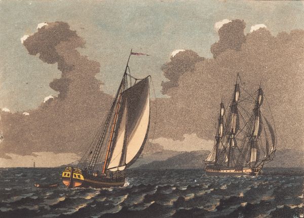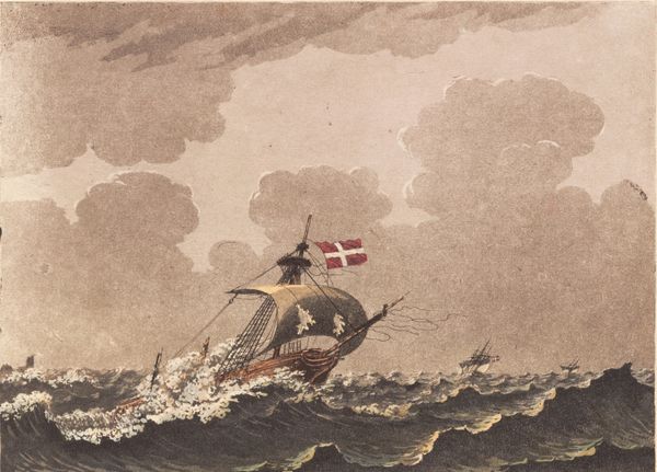 Editor: We’re looking at *An English Ship Struck by Lightning* from 1805, created with watercolor and aquatint. I am struck by the almost chaotic energy—the churning waves, the ominous sky. What do you see in this piece? Curator: I am drawn to the dramatic use of light and shadow, creating a stark contrast between the ship and the stormy environment. Consider how the artist has employed a limited palette—primarily browns, grays, and whites—to enhance the atmosphere of danger and uncertainty. Observe also how the aquatint medium lends a certain granular texture, mimicking the roughness of the sea. What do you think about the compositional arrangement? Editor: It's interesting how the ship hit by lightning dominates the center, yet my eye is drawn to the ships in the background too. They almost create a sense of receding hope. Curator: Precisely. This interplay between the foreground and background introduces spatial complexity and reinforces the ship’s isolation. How might we interpret the jagged lines of the lightning, not just as a natural phenomenon but as an aesthetic element contributing to the overall dynamism? Consider how the white foamy water contrasts against the brown of the hull, creating visual tension. Editor: So the artist is using form and colour to intensify the drama. I can appreciate how that tension really elevates the work. Curator: Indeed. By meticulously examining the formal elements and their arrangement, we unveil the work’s emotional depth. Editor: This has deepened my understanding of how technique and composition come together to evoke such a visceral response! Curator: It's fascinating how close visual analysis unlocks the layers of meaning embedded within.