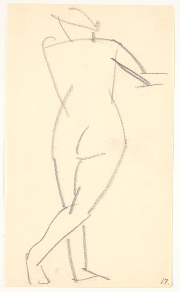 Editor: At first glance, there is a serene tranquility, almost a silent strength emanating from this drawing. Curator: Precisely. This pencil drawing, titled "Siddende model," was created by Karl Isakson between 1914 and 1915. Editor: The subject exudes a primal earthiness, like a figure pulled directly from Paleolithic Venus sculptures—the broad hips and simplified forms resonate so strongly. Curator: Indeed. Note how the artist’s focus appears to be on pure form and line—eschewing detail to capture the subject's essence. It’s as though the composition explores line and shape almost as ends in themselves. Editor: There’s a cyclical timelessness, isn’t there? Woman, figure, art, like layers folding into one another. It really transcends mere representation. I wonder about the interplay between Isakson's hand, and the paper's gentle resistance. The way the pencil moves from light strokes to definitive lines... Curator: Observe how this delicate network creates a self-contained structural dialogue within the picture plane, it has this ability to stand up by itself, it is well contained. And there are many echoes of line between one area of the image and the others. Editor: It leaves the imagination space to wander through art history, philosophy, and even personal experiences. What Isakson offers is not merely a likeness but an evocation. It's a raw depiction, that seems honest. Curator: It gives the composition integrity and rigor that transcends the literal subject matter. One recognizes a deliberate methodology, one is invited to look closely and appreciate the mastery inherent in restraint. It's the subtlety that moves me. Editor: Absolutely, after this conversation, I perceive an invitation, a moment of introspective grace to see not just an image, but allude back to the fundamental mysteries of art and life that inspired its creation.