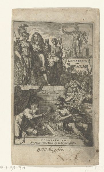 Romeyn de Hooghe created this print as the frontispiece for the first volume of "Guerres de Flandres". The artwork reflects the socio-political climate of the 17th century, a period marked by extensive conflicts in the Spanish Netherlands. De Hooghe, a key figure in the Dutch Golden Age, often intertwined his art with the political events of his time. Here, the central figure could be Neptune, Roman god of the sea, symbolizing maritime power and control, themes pertinent to the Dutch Republic's interests. The depiction includes a mix of classical and allegorical figures, which were used to add layers of meaning, reflecting the then prevalent intellectual and cultural environment. There is an emotional contrast between the chaotic battle scenes above and the calmer figures below. This contrast encourages viewers to consider the human cost of the conflicts and the power dynamics at play. The print, while seemingly celebrating military history, also subtly critiques the impact of war on society, a sentiment that perhaps reflects the growing anti-war sentiments of the time.