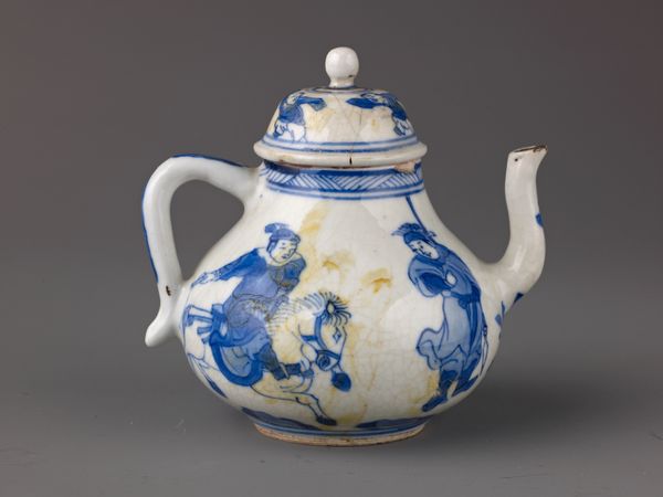 This ewer, crafted by an anonymous Chinese artist, captivates with its cobalt blue glaze and elegant form. The rounded body and slender neck create a graceful silhouette, accentuated by the rhythmic curve of the handle and spout. The intense blue hue dominates, evoking a sense of depth and tranquility. Fine gold detailing, scattered across the surface, introduces a dynamic contrast, disrupting the monochrome and adding visual complexity. These accents highlight the texture of the ceramic, emphasizing its materiality. The interplay between the smooth, polished surface and the delicate gold patterns reveals a sophisticated understanding of visual tension. It’s a subtle dance between control and chance, harmony and discord. The ewer transcends its functional purpose, becoming an exploration of aesthetic form. This is an invitation to consider how an object's form can shape our perception and appreciation of its inherent beauty.