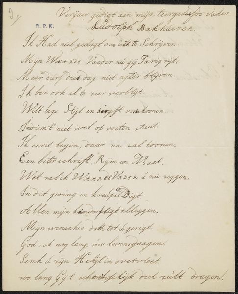 This handwritten poem about the Battle of Waterloo was produced in the Netherlands in 1824. Its focus on the artist Pieneman and his studio offers a glimpse into the world of early 19th-century art production. The poem seems to address the economics of art, referring to financiers and capital. It also touches on the artist's atelier as a space of both creativity and commerce. The reference to the Battle of Waterloo connects the artwork to a significant historical event, suggesting the poem may reflect on the role of art in commemorating or interpreting national history. To understand this poem better, we might research the Dutch art world of the 1820s and the figure of Pieneman. We could explore the relationship between artists, patrons, and the market for history painting at this time. Only then, can we come to appreciate the social and institutional conditions that shaped its creation.