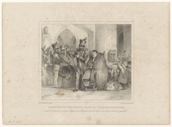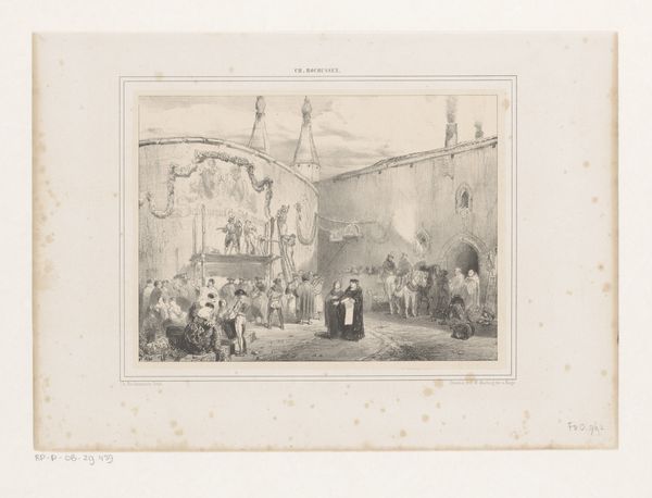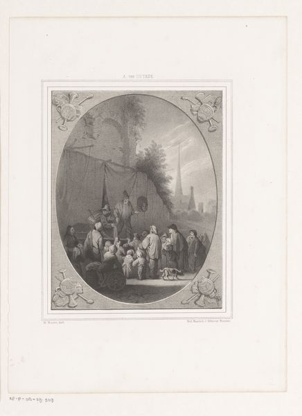 Editor: This is "Kunstbeschouwing in Arti et Amicitiae in Amsterdam," a print made by Johannes de Mare in 1851. The detailed linework capturing a room filled with people observing art is quite captivating. What compositional elements stand out to you? Curator: Initially, it is the deployment of space itself that commands attention. Note how the composition utilises linear perspective, guiding the eye through the crowded foreground toward the receding architectural details at the back. Do you see how this strategy organises and contains the chaos? Editor: Yes, the converging lines draw you into the image, past all the people. And is that repetitive pattern created by the arches? Curator: Precisely. Observe how this structural device frames the multitude of figures within the Arti et Amicitiae. This creates a rhythm and a sense of depth. Furthermore, we should consider the contrast in tonal values; observe how the artist manipulates light and shadow to delineate forms and enhance spatial relationships. Editor: I hadn't considered that – how the lighting not only illuminates the scene but contributes to the overall organization of forms. It's much more calculated than I first perceived. Curator: Indeed. Consider, too, the geometric structures imposed upon the depicted forms – the rectangular table, the cylindrical columns, the spherical chandeliers. Are they not, in their starkness, playing a significant role in understanding the artist's purpose? Editor: It seems like de Mare used the architectural space to create a structured, almost academic feel to the gathering. It reframes what at first appears to be a spontaneous moment. I appreciate your perspective on the use of geometric and spatial arrangements to inform our understanding of the subject. Curator: It is in understanding these pictorial devices that we begin to unpack meaning beyond representation. Thank you.