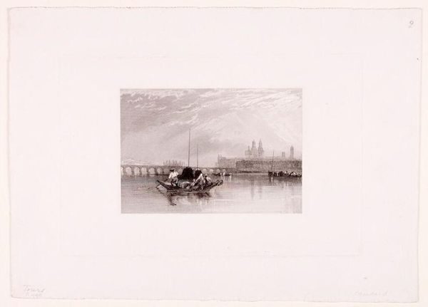 Curator: Robert Brandard created this lovely engraving, Chateau de la Mailleraie. The print gives off a rather calming effect, wouldn't you say? Editor: The textures immediately strike me. Look at the way the sky seems to weigh down on the scene, contrasted with the light reflecting off the water. It's about process and technique. Curator: Absolutely. Considering Brandard's time, let's think about the socio-political implications. This scene romanticizes the French landscape, but for whom? Who had access to such idealized imagery and how did it shape their worldview? Editor: That's a valid point. I am really captivated by the craft itself. The gradation of tones, the line work. It speaks to a highly skilled artisan, even though he's re-presenting the chateau, the vineyard, and the little figures in the boat. Curator: These depictions often reinforce social hierarchies, normalizing a very particular vision of leisure and privilege. Editor: I appreciate your perspective. This is where studying these objects informs our understanding of labor and artistic training. Curator: Indeed. It's about layering our understanding, seeing the artwork both as an object and as a carrier of cultural meaning. Editor: Well said. It's always about finding that sweet spot in context.