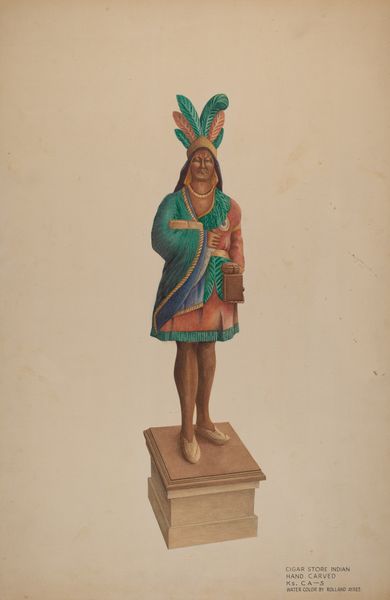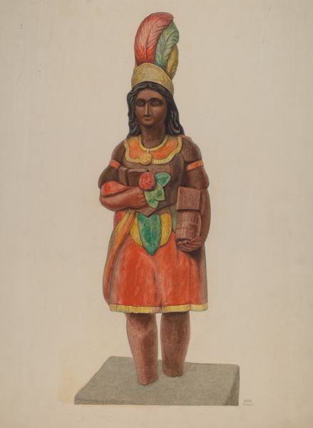 Editor: Here we have "Cigar Store Indian," around 1937, possibly oil and watercolor, by Vincent McPharlin. I’m immediately struck by how… stiff she seems. There’s a formality, an almost posed quality despite the folk-art style. What can you tell us about it? Curator: The “Cigar Store Indian,” as a painted representation, exists within a complex history of appropriation and representation. What purpose do you imagine this "stiffness" served, given the object’s probable location and function? Editor: I guess I hadn’t really thought of her in the context of advertisement before! Was it common to see artwork as advertising? Curator: Absolutely. Think about the cultural context in the early 20th century, especially the way that Native American cultures were romanticized and often stereotyped. These figures were meant to signal a particular kind of product, associate it with exoticism, perhaps. How do you feel knowing that this romanticized image of a native American served to attract the public in to smoke cigars? Editor: It is troubling to realize how such stereotypes were actively perpetuated for commercial purposes. What did McPharlin want to say about the original artwork he painted? Curator: What McPharlin wanted is still an open question. Given that the image likely had significant implications in wider American popular and commercial culture, perhaps it invites us to think more about cultural visibility and its effects in art. Editor: I had only looked at it from a purely aesthetic angle. This reframes how I understand the role of art and representation. Thank you. Curator: Exactly. And seeing art in its socio-political setting allows a fuller grasp on the complex meanings such artworks held then and hold now.