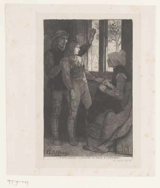 Editor: Here we have Adolph Kittendorff’s “En idyl,” created in 1862. It appears to be a print, possibly a lithograph or engraving. The scene depicts a domestic setting with a grandfather, child, and mother. It feels quite simple and earnest. What stands out to you about it? Curator: Immediately, I’m drawn to the materiality of the printmaking process itself. Consider the labour involved in producing such a work. Engraving or lithography was hardly industrialized at this point, involving skilled manual work. Look closely – the lines create form, but they also evidence labor, wouldn’t you say? Editor: Yes, I see how the texture of the lines implies that. And because it’s a print, it could be reproduced, making it more accessible. Was Kittendorff intentionally democratizing art, perhaps? Curator: Precisely! Think about the social context. In 1862, genre scenes depicting everyday life resonated with the growing middle class. This wasn't about portraying royals or religious figures, but scenes of ordinary family life accessible to all. And given the print medium, that accessibility was quite literal. We might even see this idyllic depiction of labor relations – look, no one’s idle here, the artist includes production as integral to consumption and aesthetic engagement – as a coded social argument. What do you make of that? Editor: So you're saying the material and its accessibility mirror the values depicted within the artwork itself? It’s a very interesting way to frame it! Curator: Indeed. Examining art through the lens of materials and production unveils a much richer story than just aesthetics alone. Editor: I've definitely gained a new appreciation for considering how the physical making of art informs its meaning. Curator: And I find value in how engaging in this materiality brings renewed social understanding to us.