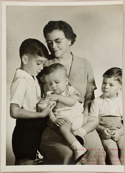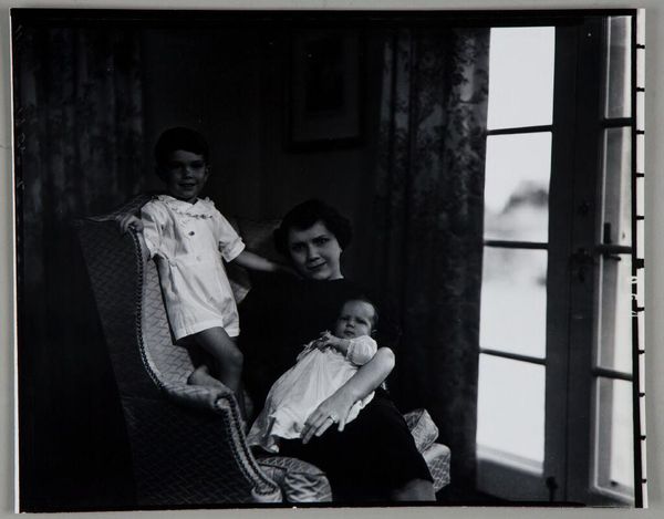This black and white photograph captures a woman with two children in an interior, and was probably made with a large format camera. Look at how the stripes on the woman’s dress create this rhythm of dark and light, a visual game almost, that the eye follows. There's a formality to the posing, a sense of stillness that is almost dreamlike, which seems to echo the pictorial style of someone like, say, Gerhard Richter. The tonality is quite rich, you can see the way the light falls on the carpet, and the soft grays that render the folds in the curtain behind the family. It's a very painterly photograph, and the composition has a real sense of balance, doesn’t it? Maybe the most compelling thing about this photograph is the way the artist has made a record of this family, while also hinting at the subtle tensions and complexities that exist within it. It’s this kind of quiet power that reminds me of the work of Alice Neel, someone else deeply attuned to the complexities of family life.