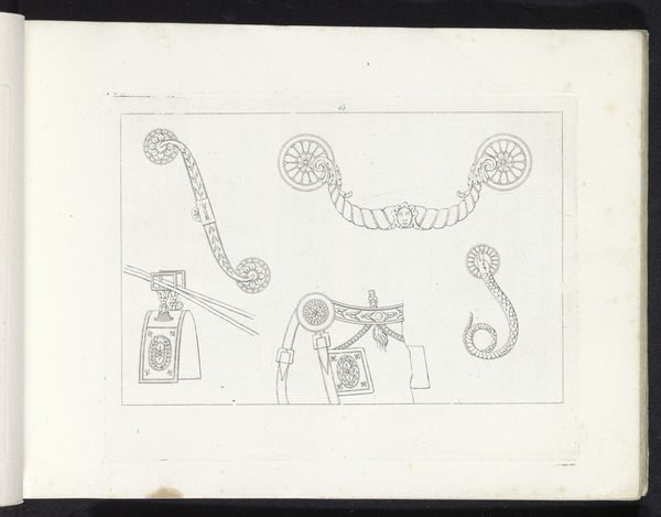 This detailed line drawing by Pietro Ruga features an incense burner, a sword sheath, and a vase. While seemingly disparate, these objects speak to rituals of status, power, and beauty, deeply rooted in their historical contexts. Notice the classical figures adorning each object, referencing ancient Greek and Roman aesthetics. These were times when gender roles were performative acts, dictated by societal expectation. The male figures, nude and athletic, embody the ideals of masculinity, strength, and civic duty. The vase, a symbol of domesticity and beauty, contrasts with the sword, an object of power and virility. Ruga invites us to consider how these objects transcend their material forms, becoming powerful symbols of societal values and individual identity. They encourage us to reflect on how we construct our own identities through the objects we choose to surround ourselves with.