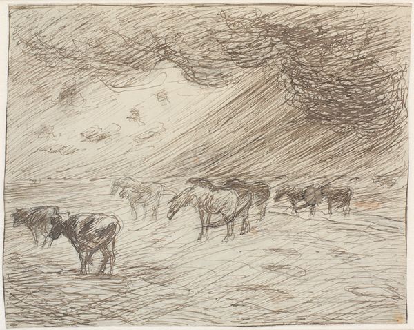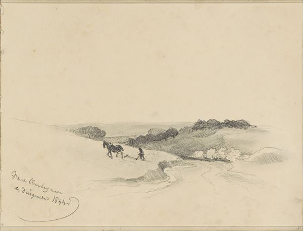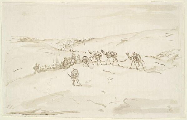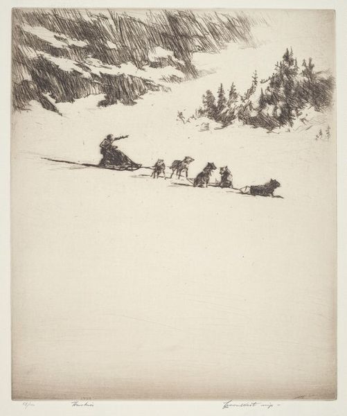 Curator: Here we have Levon West’s “The Mountain Ranger,” an etching from 1927. What is your first impression of this piece? Editor: The sense of solitude is striking. The minimalist landscape really amplifies the figure’s smallness against a vast and imposing environment. The composition and sparse marks speak volumes. Curator: Indeed. The subject, with its train of pack animals, is set against the rough-hewn peaks rendered through expressive, almost frenetic lines that suggests an active hand in depicting an uncaring Nature. Editor: It's intriguing to consider the role of landscape in American identity at this time. Was West engaging with themes of exploration, man vs. nature, perhaps in a way that echoes earlier artists of the Hudson River School, but stripping it down? Curator: That's a worthwhile association. West, in this etching, is far more restrained in his details. What remains paramount are stark tonal values—an assertive blank foreground that rises quickly toward the inky blacks above, framing the small caravan. This play is less concerned with naturalism, it is pure shape-making to amplify spatial organization within the picture. Editor: Given the period, 1927, are we meant to admire this isolated figure? The image projects this kind of frontier individualism which has historical implications that go beyond compositional space, but more within social and economic conditions of pre-Depression United States? Curator: West does, undoubtedly, rely upon American myths about hardy individualism. Consider however his approach—he avoids romantic idealization, creating a sort of middle ground between myth and the harsh realities of working within nature. This print becomes something like a meditation on scale. Editor: Perhaps. But isn't that also something that has always attracted an audience, to identify in scale with such a person? Either way, “The Mountain Ranger” succeeds as an artistic statement about the individual and landscape, albeit in contrasting senses. Curator: It encourages consideration about the weight of social narratives when put alongside formal devices of arrangement and scale. A rich and enduring dichotomy, wouldn't you say?