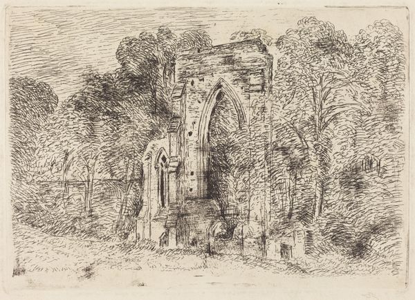 Editor: This is Rembrandt van Rijn's "Landscape with a Square Tower," an etching on paper. The details he achieves in such a small space are amazing. What do you make of the textures and the way he renders them? Curator: It's important to consider Rembrandt's innovative use of etching techniques. He manipulates the copper plate to create varied line weights and densities. How does this manipulation speak to the social context of printmaking as a means of accessible art production and distribution? Editor: So, it’s less about depicting a perfect landscape and more about the process of making art accessible? Curator: Precisely. The very materiality of the etching, the labor involved, and its potential for mass consumption challenge traditional notions of art as a unique, precious object. Editor: That’s a totally different way of looking at it; thinking about the materials and labor changes everything. Curator: Indeed. Considering the materials illuminates the social forces at play in the art world.