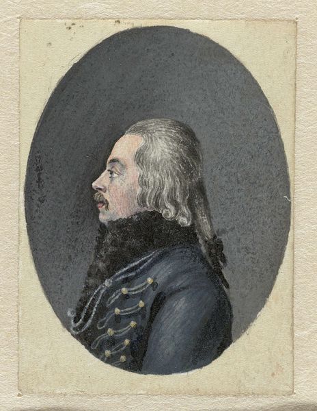 Editor: This is "Portrait of a Gentleman in an Oval Frame" by Aert Schouman, dating back to 1788. It’s a watercolor piece at the Rijksmuseum. I find it fascinating how subdued yet expressive it is; what initially grabs you? Curator: You know, it's interesting. To me, this portrait feels like catching a fleeting glimpse of someone’s soul through the gentility of the Rococo era. The oval frame sort of encapsulates the sitter, but I feel there's something beyond formality trying to peek out from his gaze. Do you sense a narrative beyond the surface, perhaps a touch of melancholy hiding beneath his powdered wig? Editor: I hadn't really picked up on a sense of melancholy, but now that you mention it, I see it. Perhaps the loose handling of the watercolour contributes to that, compared to, say, a very crisp oil painting of the time? Curator: Absolutely. Watercolour offers such transparency; every delicate wash can either illuminate or shroud. Schouman captures a certain lightness, a breath caught in time. Also, think about the powdered wig - such a cultural signifier. What does it say about status, and perhaps the burdens of it? Editor: That's a fantastic point; it's not just about status but the constraints of it too, almost a mask of respectability. I guess, thinking about the Rococo period, that idea of superficiality versus deeper emotion plays into it? Curator: Exactly. Art often becomes this incredible dance between outward appearance and the hidden self. And how does the use of watercolour specifically shape that dance in this work, do you think? Does it reveal or conceal? Editor: I think the softness of watercolor gently peels back some layers, hinting at a personality that's perhaps a bit weary of the formality around it. Thanks, that’s helped me see so much more in this! Curator: And thanks for seeing it with fresh eyes! Isn't it lovely how art keeps evolving through our shared observations?