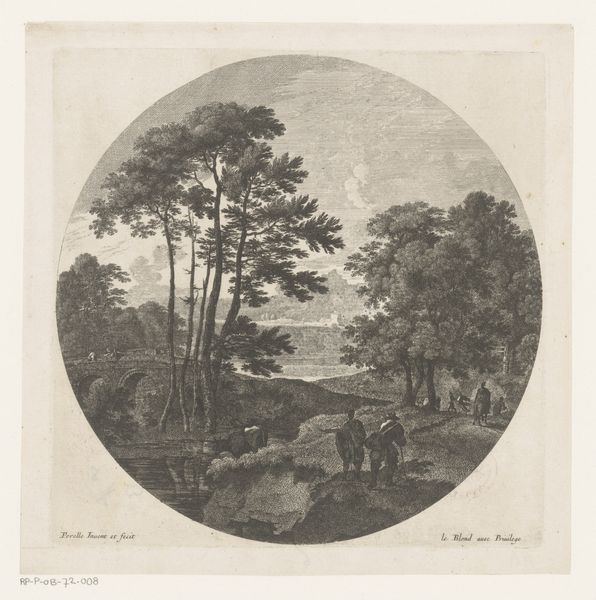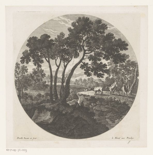 Stefano della Bella created this print, Plate 6 from 'Roman landscapes and ruins', using etching techniques. Born in Florence, Della Bella’s experiences as a draughtsman shaped his approach to printmaking. Note the circular composition. Consider its ties to broader themes of pastoral life and idealized landscapes that were en vogue at this time. The etching depicts cattle crossing a valley, accompanied by a horseman in the background. While seemingly a simple scene, it invokes the complex relationship between humans, animals, and the land. The imagery of grazing animals in a landscape may evoke a sense of tranquility, but also speaks to human intervention and control over the natural world. How does the artist invite us to reflect on our place within the environment? The print invites us to contemplate our relationship to labor, nature, and the enduring impact of human presence on the land.