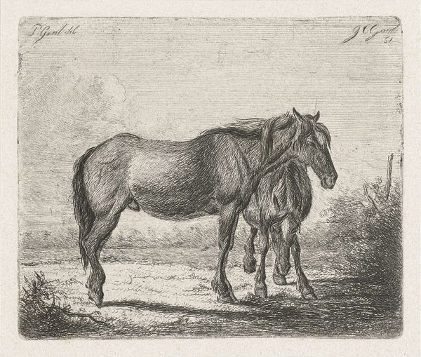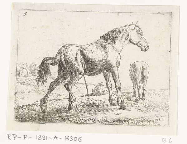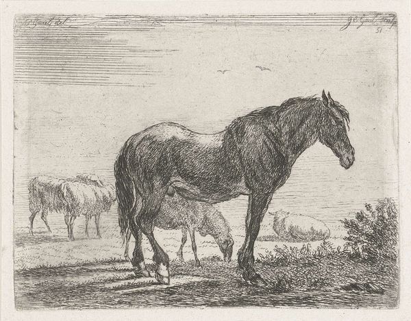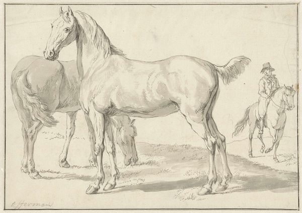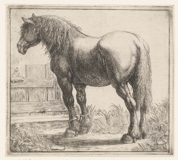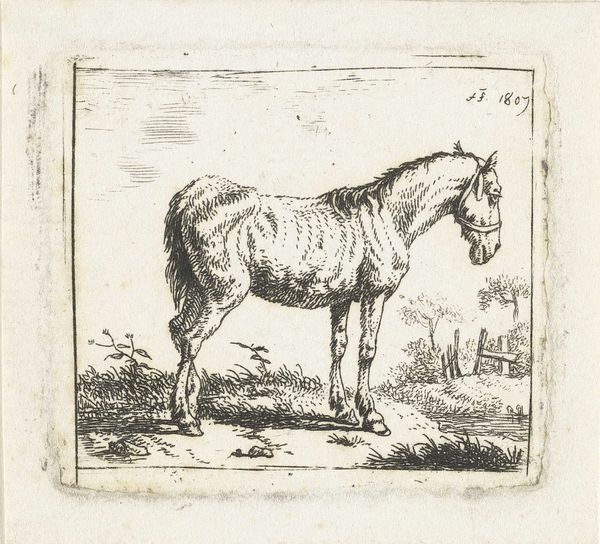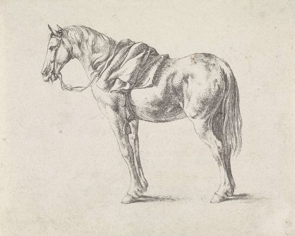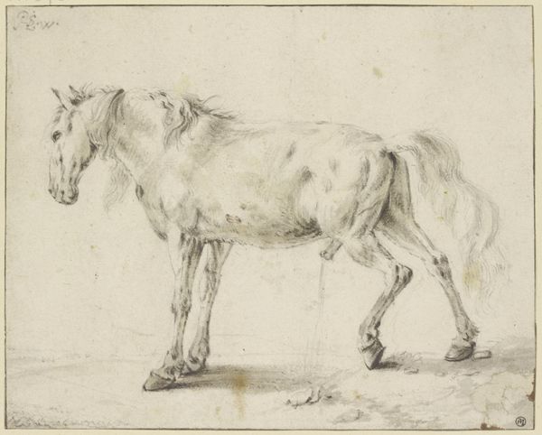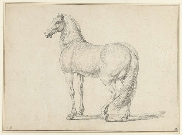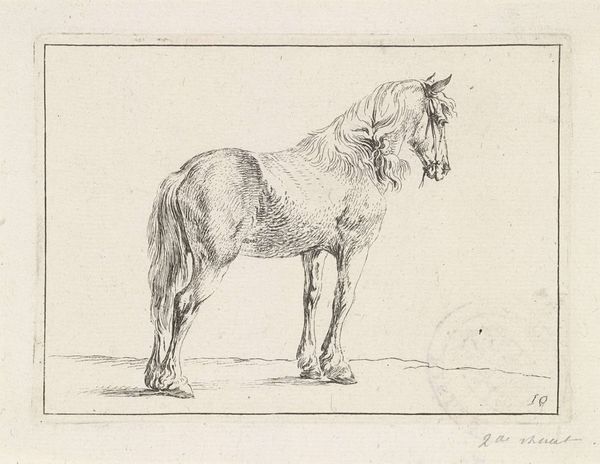 Editor: So, here we have "Standing Horse to the Right" by Johannes Mock, created in 1828. It's a detailed drawing, almost a print, really. I find it very simple and peaceful. What strikes you about this work? Curator: The image of the horse carries immense symbolic weight. Consider its historical significance – representing power, nobility, and freedom. Here, in this drawing, does the horse appear powerful to you, or something else? Editor: Hmm, it does appear serene, more domesticated somehow. Less a symbol of untamed wilderness. Curator: Precisely! The horse in art can also represent more internalized drives: passion, instinct, the unconscious. Note how Mock rendered the musculature – there’s strength implied, but a certain gentleness as well. Consider the Romanticism movement that it is tied to...do you find symbolism there? Editor: That's interesting. I was drawn to the realism of the rendering itself, but within Romanticism there’s an emphasis on emotion, right? Maybe the horse’s quiet posture invites introspection? Curator: Exactly. This detailed depiction connects to a broader theme in art and literature – the contemplation of nature, and of humanity's place within it. And perhaps also our own internal 'animal' nature that requires mastering. The cultural memory tied to the horse echoes across centuries. How does that resonate with you, seeing this image today? Editor: I guess, in our modern context, it’s a reminder of a connection to nature we’ve largely lost. Curator: Indeed. Perhaps Mock captured a longing we still share. It also reminds me that we are animals also, but civilized. Editor: I hadn't thought about it that way, this makes the piece richer for me.