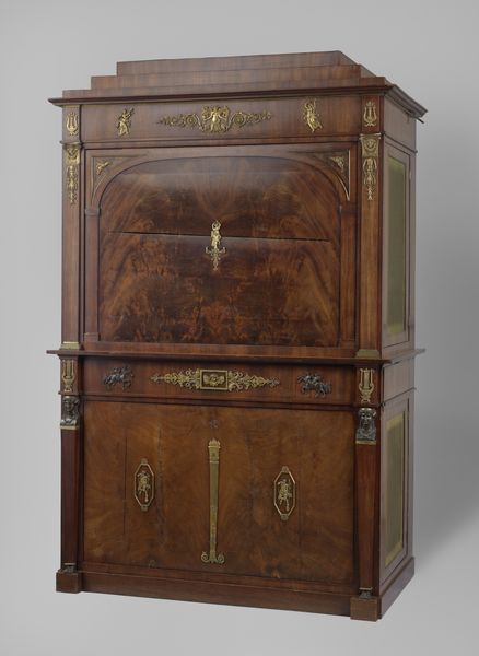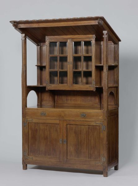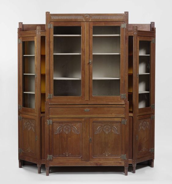 Curator: Here we have a striking example of Art Nouveau craftsmanship: the “Buffetkast van coromandelhout, deels belijmd met amboinawortel,” or Coromandel Wood Sideboard, partly decorated with Amboina Root. It's dated circa 1900 to 1930 and is part of the Rijksmuseum’s collection, attributed to Carel Adolph Lion Cachet. Editor: Wow. It feels like stepping back in time. A time capsule, almost, holding onto secrets from the turn of the century. It has a wonderful warm feeling to it. I love how those various woods swirl together. Curator: The use of coromandel wood, along with the amboina root, exemplifies Art Nouveau's penchant for exotic materials and natural forms. Note the deliberate geometric structuring combined with organic, flowing lines in the carvings. The structure juxtaposes squares, rectangles, and that bold semi-circular arch at its crown. Editor: Those carvings! The delicate woodwork that supports the upper display sections is enchanting. But the upper section gives me a heavy feeling...almost like the spirits trapped behind the glass. Curator: While emotional interpretation has its place, consider the artist’s formal intentions. Cachet likely employed these motifs to evoke a sense of luxury and refinement, reflecting the decorative principles of the movement. Also, the central glazed display section functions as a focal point. Editor: True, it's gorgeous. The warm color palette does create that sense of luxury and... intimacy, too. But maybe the way it towers over us enhances the feeling of holding hidden secrets. Curator: Consider how this sideboard exemplifies Art Nouveau principles—integration of nature, embracing modernity with handcrafted details, and overall symmetry in design. All that aside, I confess to sensing a bit of whimsy about it. Editor: Exactly! Seeing that sense of warmth that surrounds this particular period. Almost feels as if you should place it inside a room while the smell of baked bread wafts through the space.