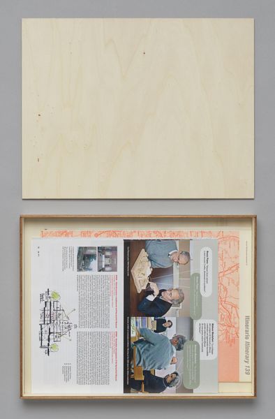 Editor: We're looking at Gian Maria Tosatti's "I’ve already been here. America" from 2011, a mixed-media collage inside a stark, heavy frame. It feels… disjointed. Like fragments of memories pinned to a board. There's a blank sheet of paper hanging front and center and three enigmatic photographs of the rear side. What do you see in this piece? Curator: Well, for me, it feels like a whisper from a forgotten roadside motel. You know, those places on Route 66, ghosts of a shimmering American Dream. That blank paper? I almost want to fill it with stories – of truckers, poets, runaway lovers. Maybe the stories don’t matter, what really is there, is just longing and anticipation. Editor: The photographs almost seem like clues… one looks like a house, another like… an explosion? Curator: Exactly! A haunting visual haiku. The house could be Anywhere, USA, then BOOM, the American sublime takes over. And then this final image is perhaps life? I wonder if Tosatti is nudging us to confront a dissonance. That beautiful-terrible pull between aspiration and destruction. Is there room in the frame for both? And for a life? What does the title suggest to you? Editor: "I’ve already been here." Perhaps it's a cynical reflection on America's cyclical nature... that promise of greatness, shadowed by repeating mistakes. Curator: Or, maybe, a recognition that within every dream lies the seed of its potential demise. Is there anything beautiful even in destruction, I wonder, just maybe? Editor: This piece definitely hits differently now! What appeared disconnected is interwoven so carefully to create tension. Curator: Exactly! Isn’t it wonderful how a work of art can shift our perspective, revealing complexities we never even suspected?
