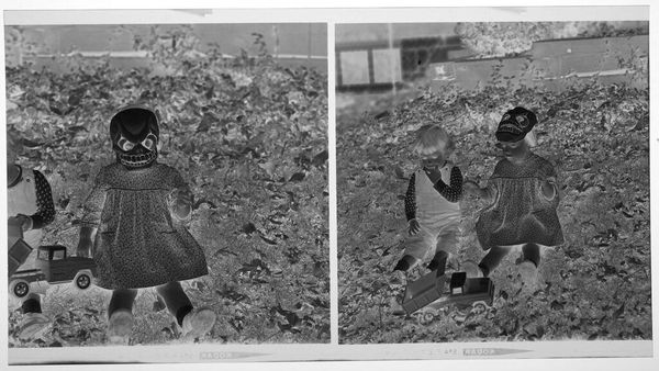 Editor: This silver gelatin print, "Untitled (little girl in dress, outside)" by Lucian and Mary Brown, has a quiet, almost melancholic feel. The tonality is inverted, which gives it an ethereal quality. What do you see in its composition? Curator: The negative tonality forces us to reconsider our assumptions about light and shadow, doesn't it? Observe how the formal elements – the texture of the grass, the shape of the girl's dress – take precedence over any narrative. Editor: So, it's more about the visual relationships than the story being told? Curator: Precisely. The high contrast emphasizes form and texture, creating a visually arresting image that transcends simple representation. The composition invites the viewer to analyze its shapes, patterns, and tonal values. Editor: I see what you mean; I hadn't considered how the negative space contributed so much to the overall effect. Curator: Indeed. And by focusing on these formal aspects, the Browns encourage a deeper engagement with the photograph as an object of aesthetic contemplation.