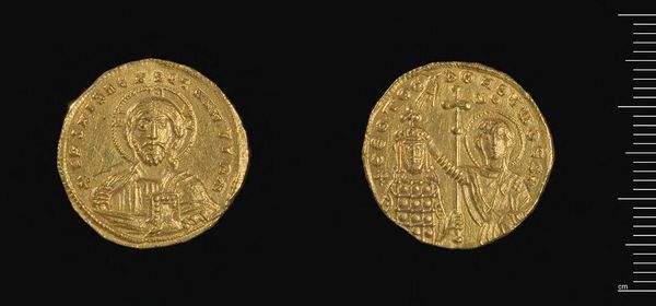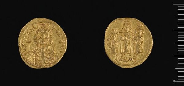Curator: Here we have a gold coin issued by Constans II, whose reign over the Byzantine Empire began in 641 CE. Editor: The luster of the gold really stands out, doesn't it? There's an immediate impression of wealth and power. Curator: Indeed. Notice how the composition is divided into two distinct sides, each meticulously detailed yet adhering to the coin's circular frame. Editor: The obverse depicts Constans II with his son, Constantine IV. The imagery implies a dynastic continuity, projecting stability through the shared imperial regalia. Curator: Yes, and the reverse reinforces this stability with a cross potent on steps, flanked by the figures of his other sons. The formal symmetry emphasizes order. Editor: Order, but also the weight of responsibility passed down. It's more than mere political imagery; it's a statement of divine sanction. Curator: I appreciate how your symbolic reading enhances the purely visual experience. It all adds layers to this precious metal. Editor: And it gives us a richer understanding of the message these images hoped to convey to a vast and diverse population.