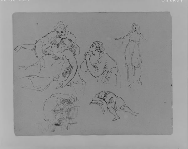 Editor: Here we have Thomas Sully's '(From Sketchbook),' created sometime between 1810 and 1820. It's an ink drawing on paper. What strikes me most is its rawness – a peek into the artist’s process. What can you tell me about how sketchbooks functioned in the early 19th century? Curator: Precisely. This wasn’t intended as a finished work, but as part of Sully’s artistic investigation. During this era, sketchbooks became increasingly important tools for artists, serving as portable studios where they could record observations, experiment with compositions, and develop ideas for larger, more formal pieces. Consider how this contrasts with the more public role paintings held in exhibitions and aristocratic collections. Editor: So, the sketchbook offered a private space for exploration before exhibiting or selling works publicly. Did artists usually show these sketches? Curator: Rarely. Their value lies in revealing the artist's thought process, unburdened by the expectations of the art market or the Salon. They offer invaluable insights into the artist’s training, sources, and development of ideas. Look closely: do you notice classical figures, reminiscent of ancient sculptures, perhaps suggesting his academic training and sources of inspiration? Editor: Yes, especially the central figure and the group at the top right – they feel very classical. I suppose it makes sense, given Sully’s aspiration to elevate American art by incorporating European academic training. Curator: Exactly. And consider how Sully’s drawings could be perceived within an American context striving for cultural legitimacy on the world stage. Were these sketches simply private exercises, or did they implicitly contribute to the formation of an American artistic identity rooted in European traditions? The interplay between privacy, artistic education, and cultural aspiration reveals a fascinating complexity. Editor: This makes me think about the tension between private study and public presentation. I'll definitely consider Sully’s position in early 19th-century American art differently now! Curator: Indeed, looking at something so intimate provides a rich framework to further discuss how art evolves in various political and cultural arenas.
